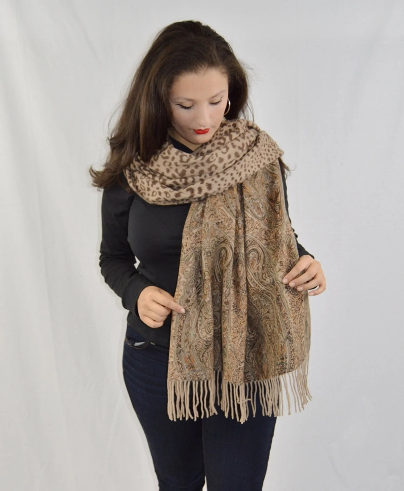 · This reversible Cashmere scarf has Leopard print on one side and elegant Paisley print on the other (Black color is solid black on one side and paisley print on the other side). Woven from some of the finest Cashmere hairs in the world, these scarves are truly elegant, sophisticated yet practical. Aside from the versatility of such a wonderful accessory, it is offered at a fraction of the price. Comparable Cashmere shawls are unbelievably expensive. Dry cleaning is recommended.