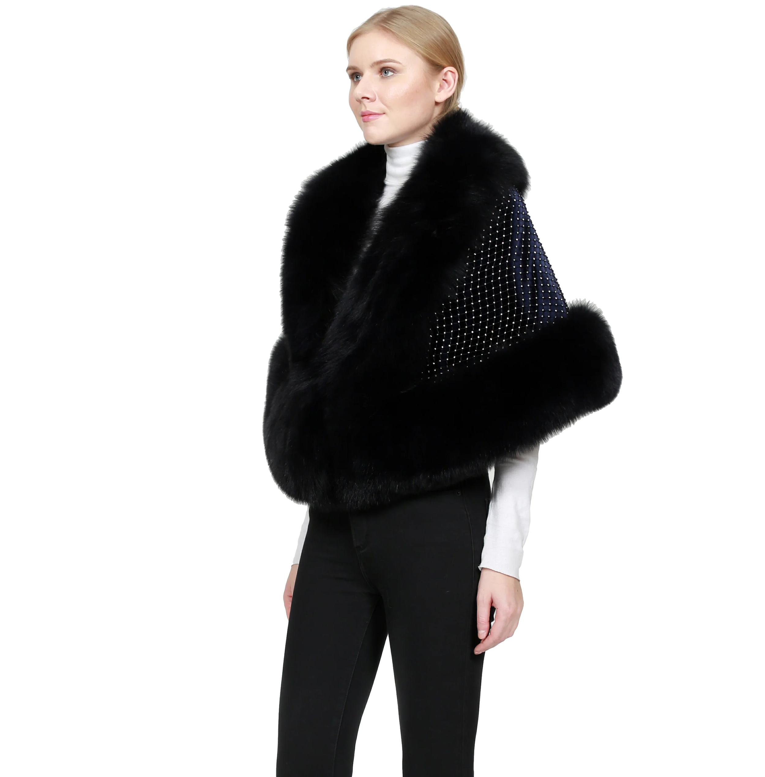 This Fox Trimmed Cape is truly elegant, sophisticated, and practical, offering versatility and style at a fraction of the price compared to similar options on the market. The plush five (5) inch Fox Fur trim adds a luxurious touch, while the Swarovski Crystal net design elevates the cape to new heights of glamour.