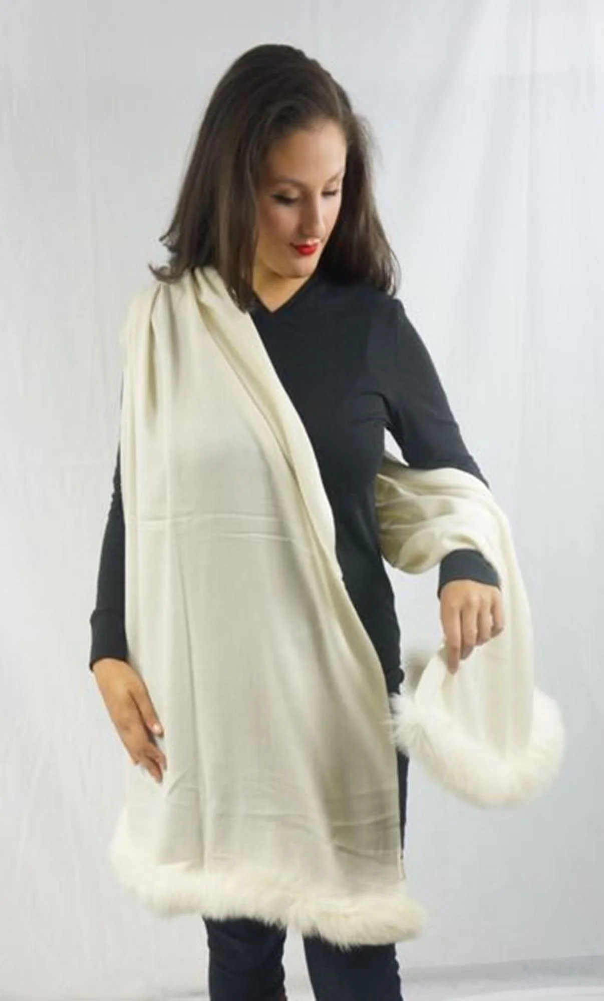 Wrap yourself in our gorgeous pashmina wool and silk shawl with matching color fox trim on the ends, this amazing combination of all the natural yarns will excite your senses. Our generous classic twill weave shawl is made up of approximately 70% pashmina wool and 30% silk and is absolutely opulent with its sumptuous fox trim on each end. Like our other classic pashmina/ silk wraps, you can wear it fully opened for the dramatic shawl look or you can fold it in half to have the look of a stole, fold it twice and you’ll transform it into a scarf with a beautiful finished fox trim