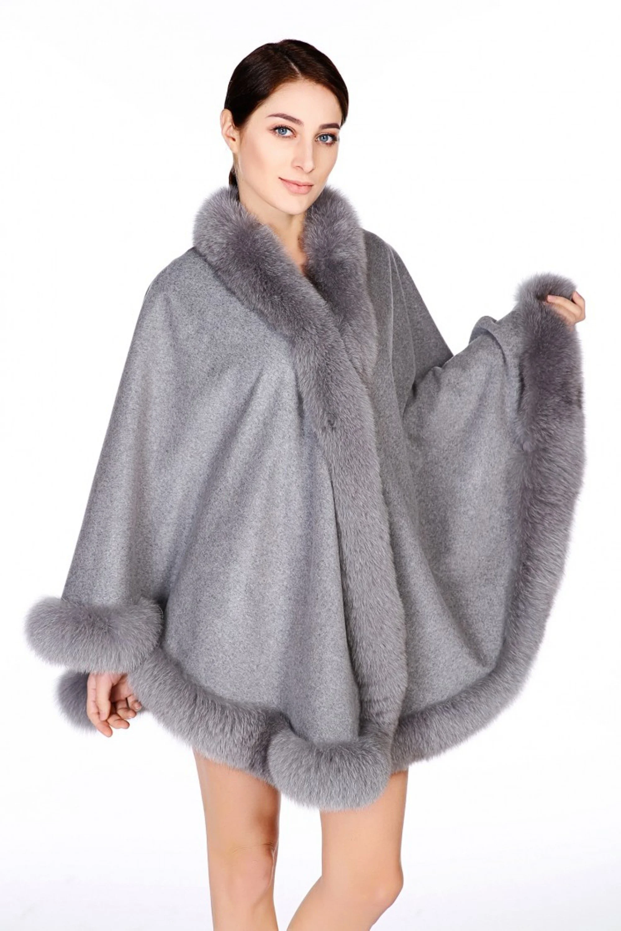 Cashmere Cape (CRB005 Style) for $399 This style cape has lush Fox Fur collar and Hefty fur pom-pom ties . The Cashmere cape is completely lined . The cape is 31” long and 184” in circumference.