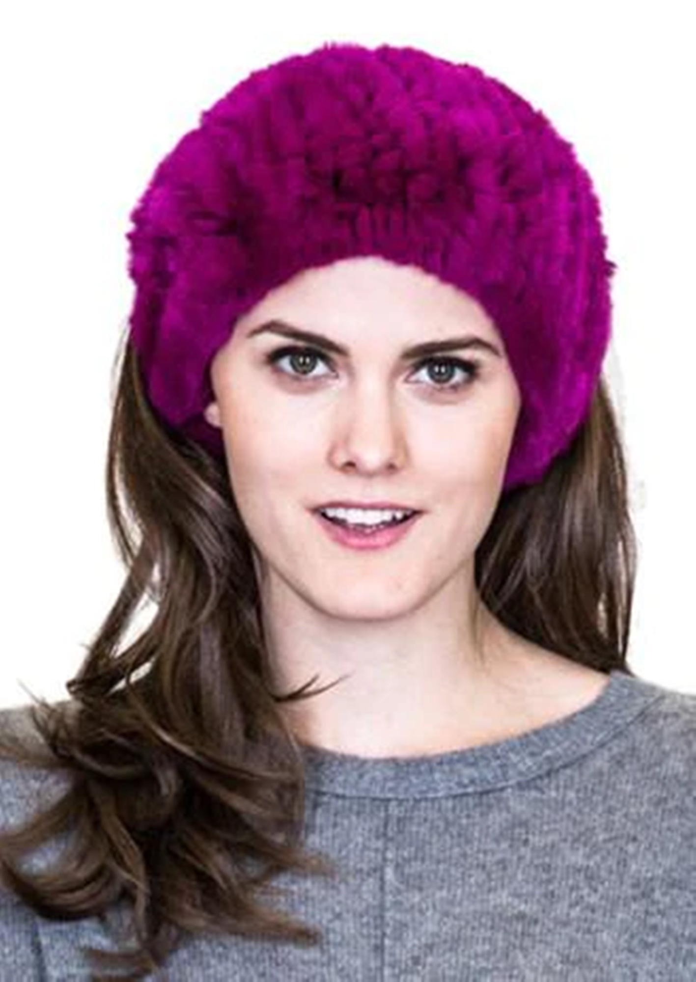 Knitted Rex Rabbit hat with rosette. These hats are handmade knitted. The fur is genuine Rex Rabbit fur. The hats are light weight and warm and Stretchable. They fit comfortably. Fur is on both sides. One size fits all. Imported.