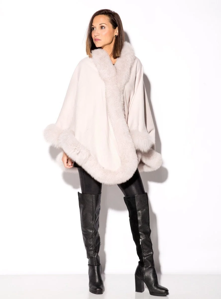 • This Cashmere cape with lush Fox Trim can easily be worn every day, these capes can be layered over a jacket/coat or can be worn as a cape over slacks and suits. Of course, these Cashmere Capes are just as stunning as a wrap over evening clothes too! Our Cashmere Capes transform any outfit and are exceptionally fashionable, fun and easy to wear.