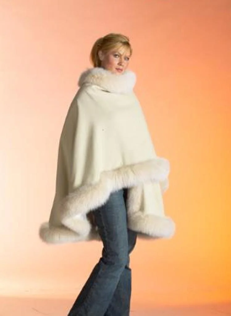 Cream Fox-Cashmere Cape 3-Ply Thick with Fox Fur Trim-Cape-Capes- Cashmere Cape with Fur Trim-Ruana-Shrug-Coat-Caplet-Fur Cape-Fur Capes for women