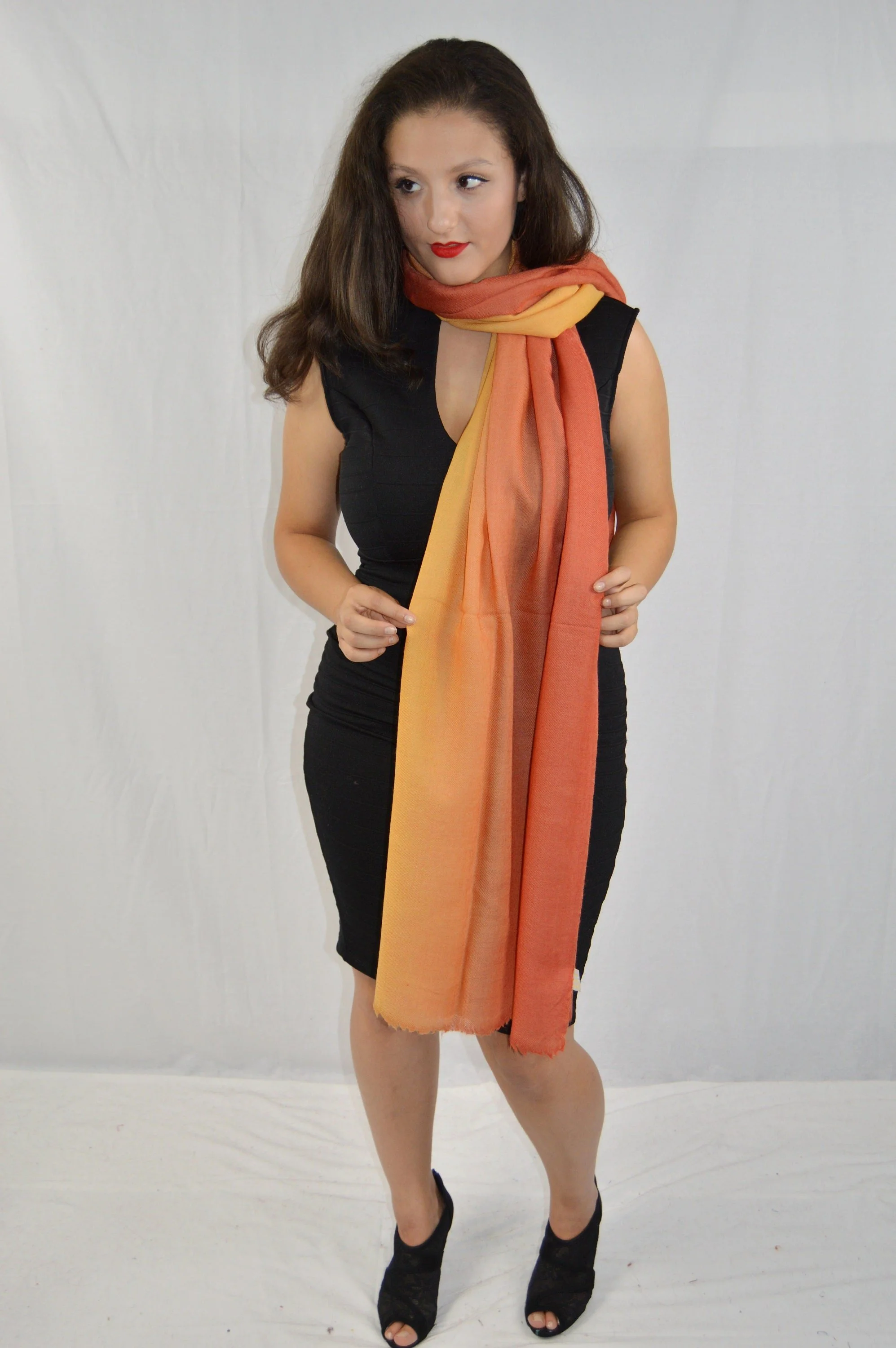 • Hands woven in India, these Graduation/two-toned Cashmere shawls are incredibly butter soft and extremely warm. Available in many colors, the dimension of these Cashmere shawls are 78" in length and 28" in width. With the classic unfinished edges, these shawls look very sophisticated and elegant. The absolute beauty of this cashmere accessory is the fact that while you will barely know it’s on, you will feel its warmth!